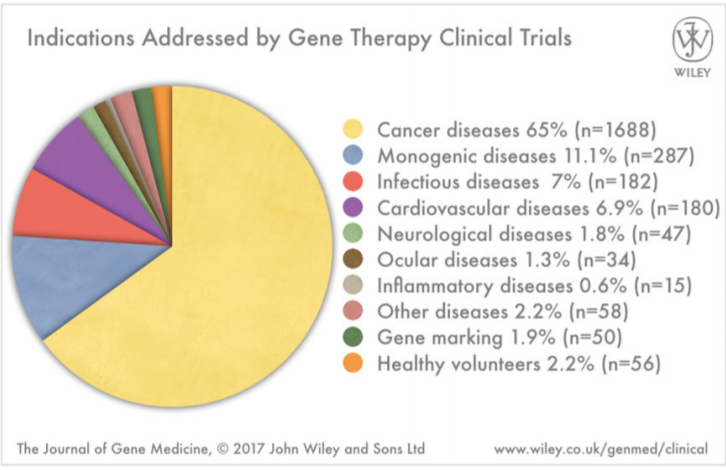 Παρόλο που οι αρχικές μελέτες ήταν περιορισμένες σε μονογονιδιακές ασθένειες, μεταγενέστερα παρατηρήθηκε μια διεύρυνση του φάσματος των γενετικών ασθενειών που αποτέλεσαν στόχοι της γονιδιακής θεραπείας. Όπως φαίνεται και στην εικόνα 2, ο καρκίνος αποτελεί τον κυριότερο στόχο της γονιδιακής θεραπείας. Στη συνέχεια ακολουθούν με χαμηλότερα ποσοστά μονογονιδιακές ασθένειες, λοιμώδεις ασθένειες, καρδιαγγειακές νόσοι και διάφοροι άλλοι τύποι ασθενειών.