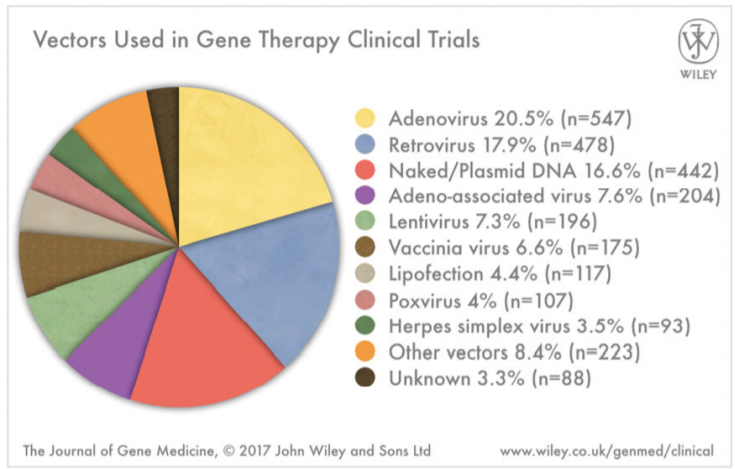 Ως οχήματα μεταφοράς γονιδίων έχουν χρησιμοποιηθεί τόσο ιοί που έχουν DNA, όσο και ιοί που έχουν RNA ως γενετικό υλικό (είτε μονόκλωνο είτε δίκλωνο).