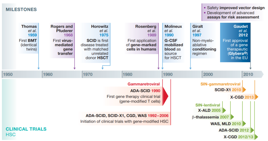 Εικόνα 3: Χρονοδιάγραμμα κλινικών δοκιμών γονιδιακής θεραπείας που βασίστηκαν στη χρήση αιμοποιητικών βλαστικών κυττάρων.