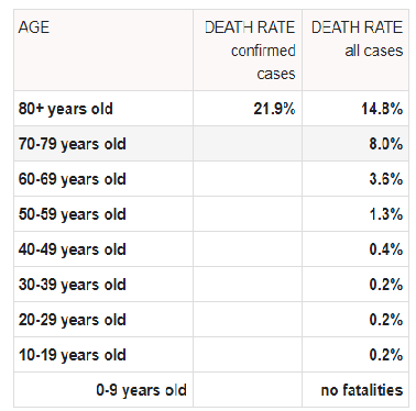 Όσον αφορά τη θνησιμότητα ανά ηλικιακή ομάδα, αυτή φαίνεται στον παρακάτω πίνακα του ‘’WHO’’( World Health Organization)