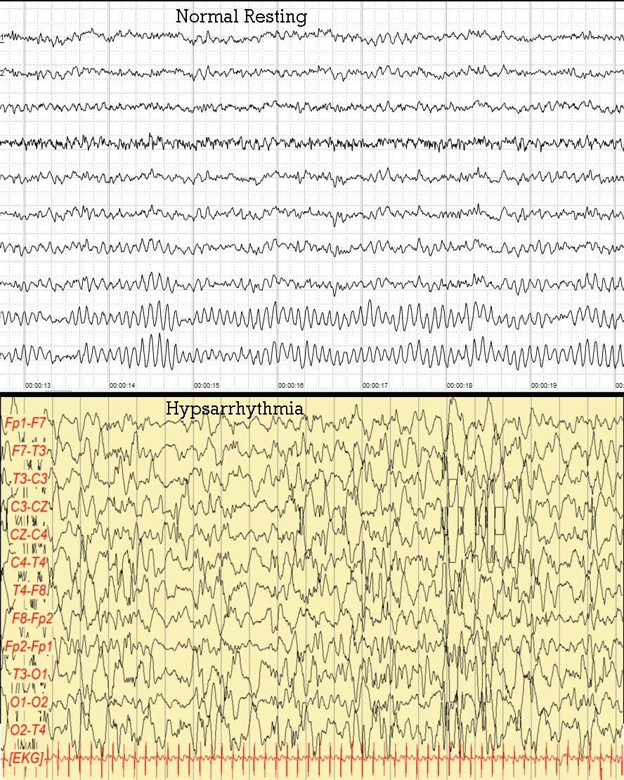 Αρχικά, το εγκεφαλογράφημα είναι μια ανώδυνη διαγνωστική εξέταση και χρησιμοποιείται για την διάγνωση εγκεφαλικών παθήσεων και βλαβών. Το παθολογικό εγκεφαλογράφημα, ενός παιδιού με σύνδρομο West θα έχει διάχυτες, βαθιές, παροξυσμικές ανωμαλίες και ο τύπος αυτός ονομάζεται υψαρρυθμία (hypsarrythmia).