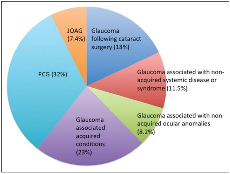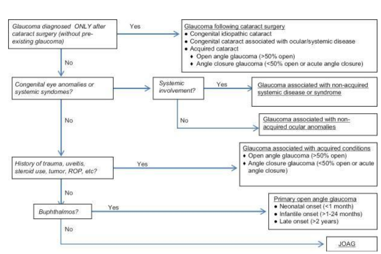 πρωτοπαθές συγγενές γλαύκωμα και το νεανικό γλαύκωμα ανοικτής γωνίας. Οι κατηγορίες του δευτεροπαθούς παιδικού γλαυκώματος συμπεριλαμβάνουν το γλαύκωμα που σχετίζεται με μη επίκτητη οφθαλμική ανωμαλία, το γλαύκωμα που σχετίζεται με συστηματική ασθένεια ή σύνδρομο, το γλαύκωμα που σχετίζεται με επίκτητη κατάσταση και το γλαύκωμα μετά από εγχείρηση καταρράκτη. Σύμφωνα με τις νέες ερμηνείες του CGRN, αν ένα παιδί έχει υποκείμενη κατάσταση που προδιαθέτει για γλαύκωμα και είχε υποβληθεί σε εγχείρηση καταρράκτη, τότε η διάγνωση θα ηταν γλαυκώματος μετά από εγχείρηση καταρράκτη μόνο εάν το γλαύκωμα αναπτυσσόταν αμέσως μετά την εγχείρηση. Σε διαφορετική περίπτωση, η διάγνωση θα σχετιζόταν με την υποκείμενη πάθηση.