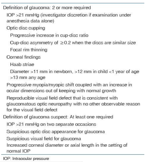 επίκτητες καταστάσεις, 7,92 έτη, ενώ αυτών με υποψία γλαυκώματος ήταν 6,75 έτη. Μία σύντομη κατηγοριοποίηση του παιδικού γλαυκώματος σύμφωνα με το CGRN παρουσιάζεται στον πίνακα 2: